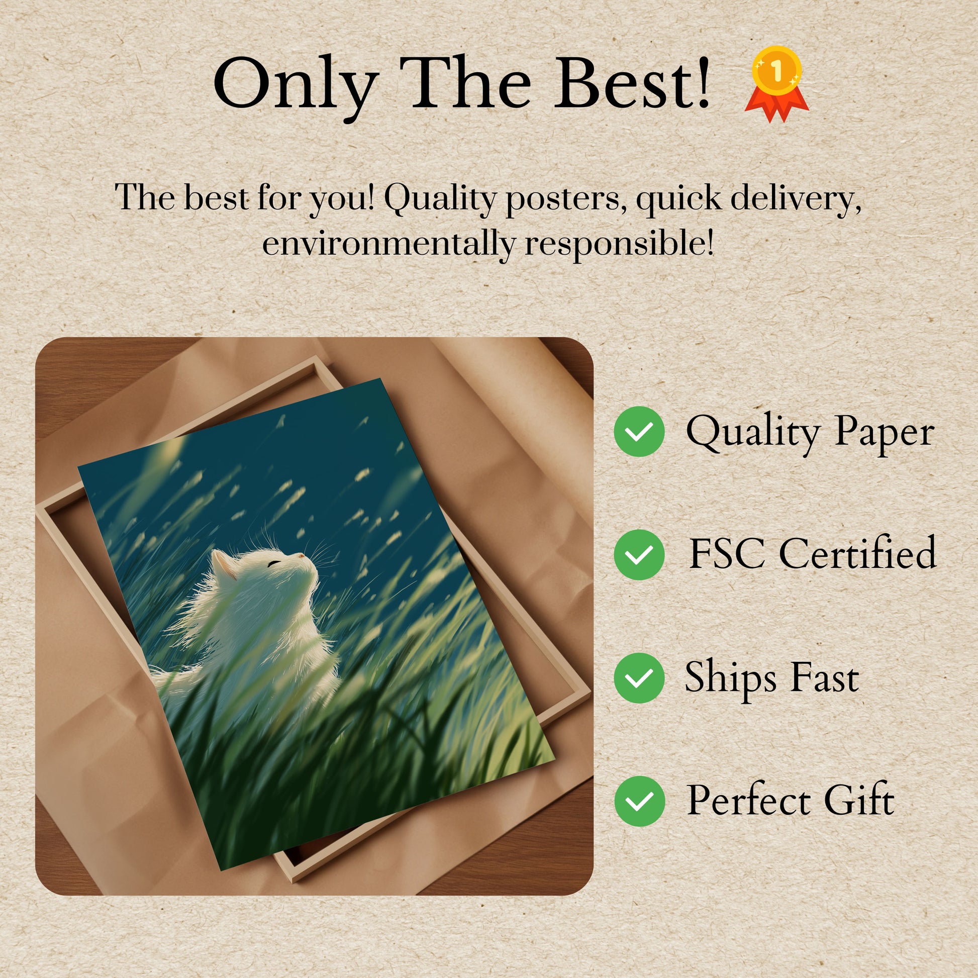 Todos os nossos pôsteres são feitos em papel premium de 170 g/m² certificado FSC para garantia ecológica.