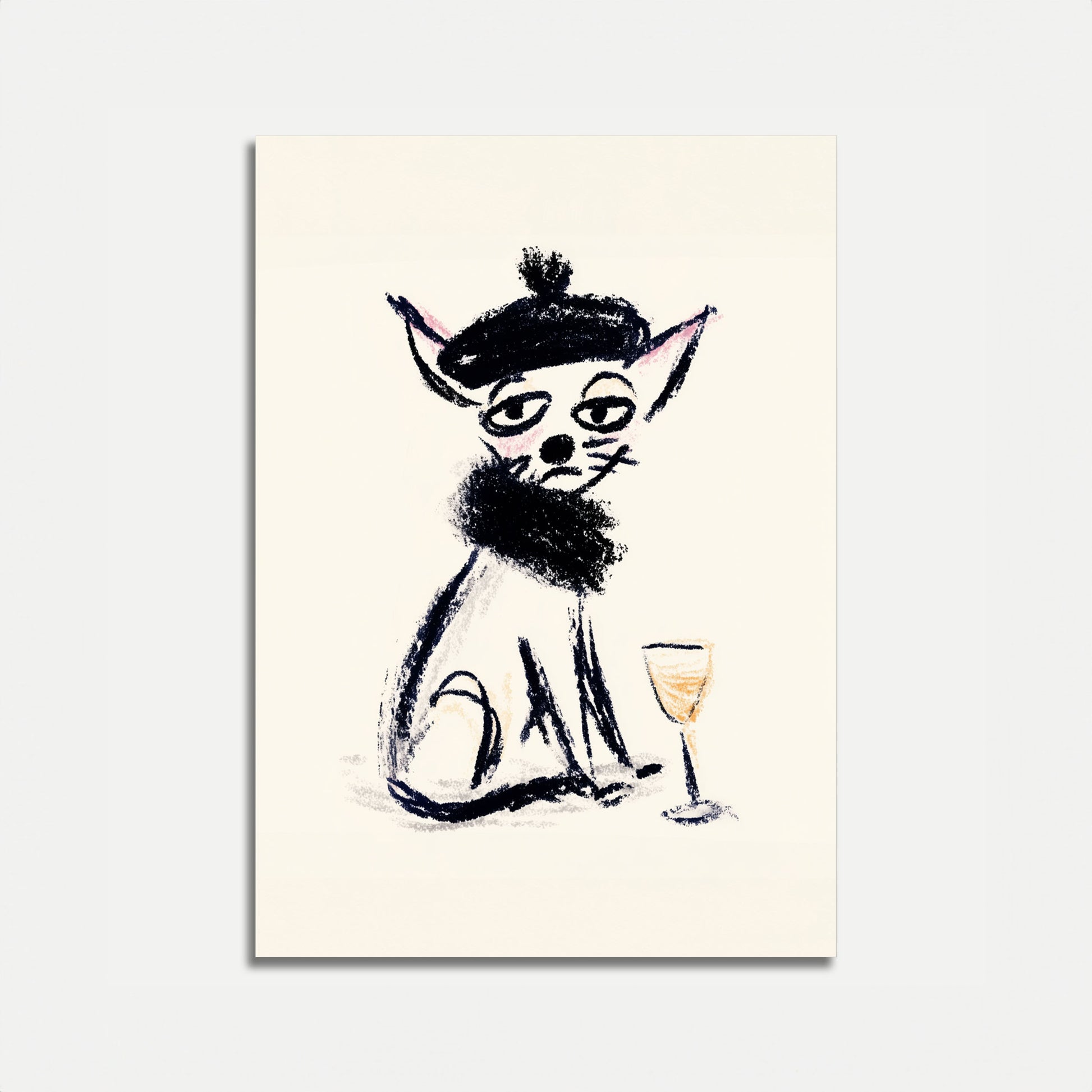 Esta ilustração encantadora captura uma elegante companheira felina com um ar de refinamento sofisticado e humor contido. O esboço apresenta um gato chique usando um belo boné preto e lenço, completo com um cigarro e taça de vinho—uma mistura perfeita de sofisticação parisiense e atitude lúdica. A obra de arte minimalista em preto e branco com suaves acentos rosa cria uma estética moderna, digna de galeria, que traz personalidade e calor a qualquer espaço, seja uma sala de estar, quarto ou estúdio criativo.