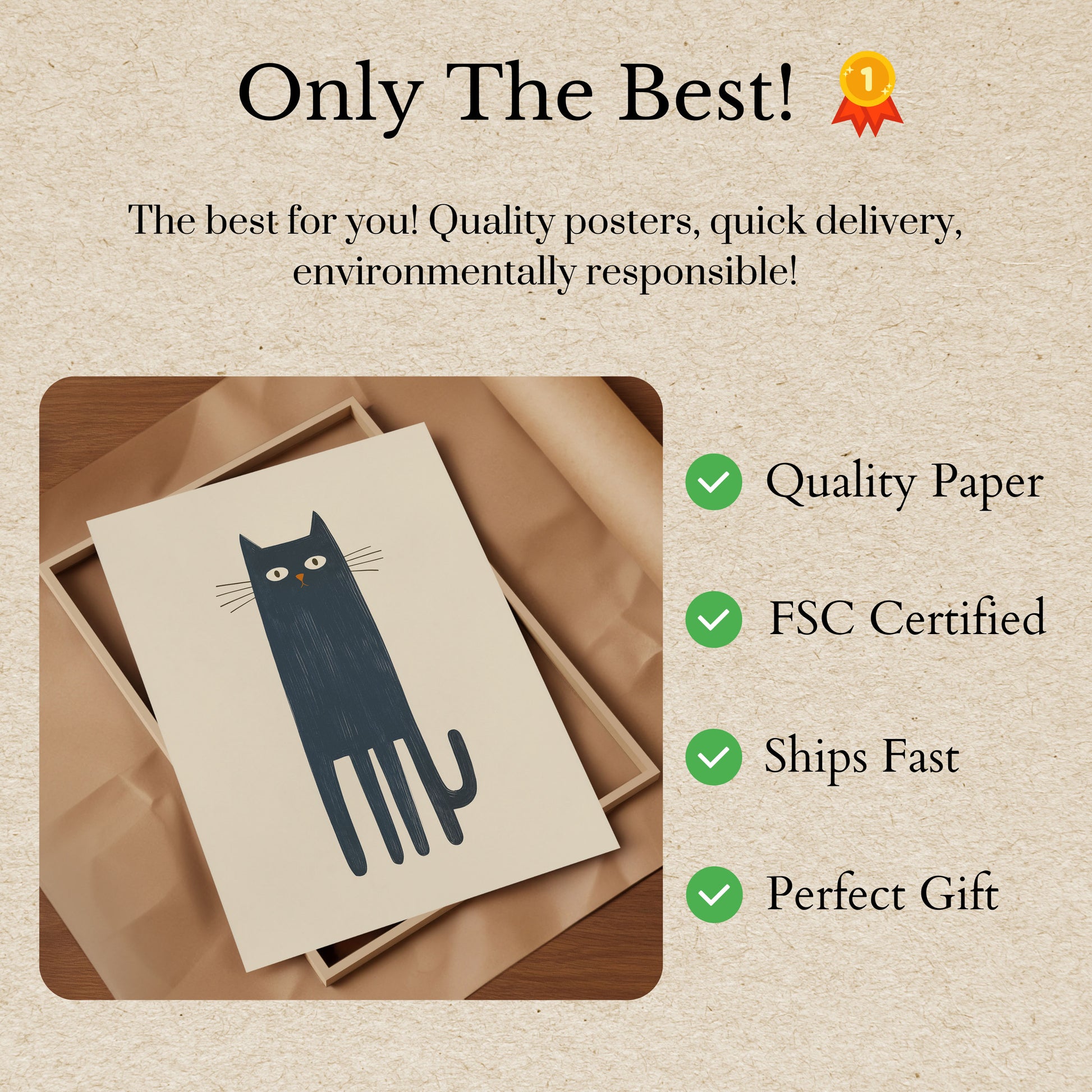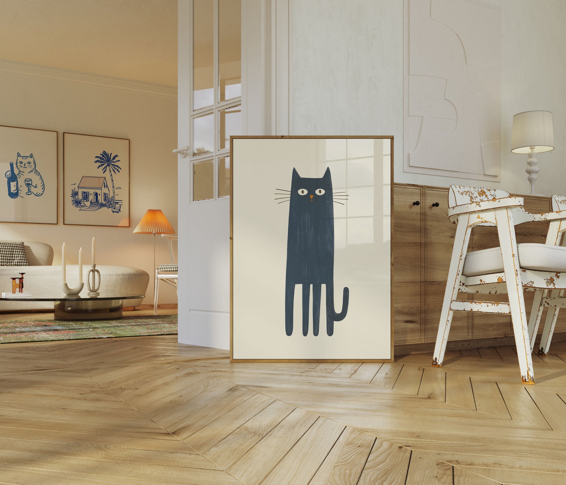 Conheça o felino mais adoravelmente alongado com um olhar de olhos arregalados inesquecível. Este charmoso pôster de gato preto apresenta um design minimalista com uma silhueta alta e esticada e um rosto expressivo que captura a pura personalidade felina. A paleta de cores simples, com azul marinho profundo contra um fundo creme, cria um clima calmo mas brincalhão, enquanto aqueles olhos perfeitamente redondos e pequeno nariz laranja conferem a este gatinho um encanto inegável. Perfeito para amantes de gatos e qualquer pessoa que aprecie arte animal moderna e excêntrica que traz um toque de humor e calor para qualquer ambiente.