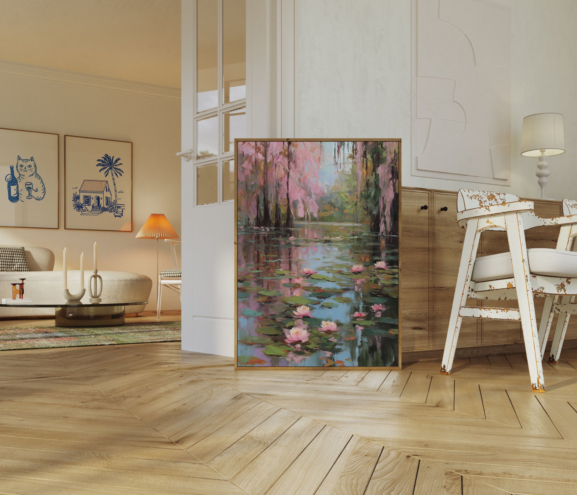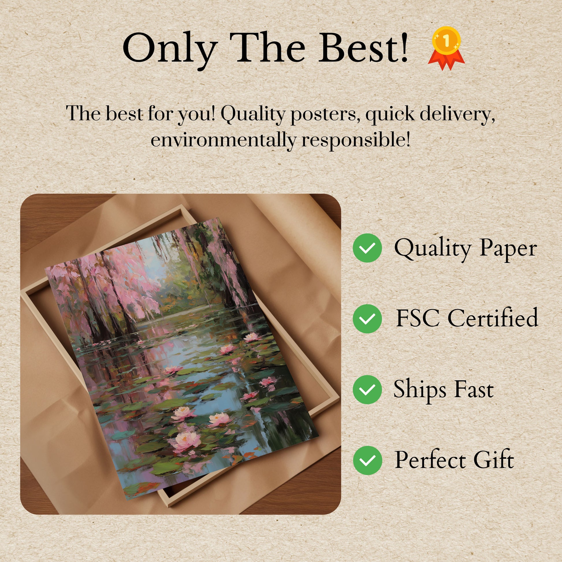 Steg in i ett lugnt botaniskt paradis med denna fantastiska målning av näckrosor. Ömtåliga rosa blommor flyter graciöst över en fridful damm, omgiven av höga träd med mjuk rosa och grön lövverk som skapar en fredlig, drömlik atmosfär. Konstverket fångar essensen av naturlig skönhet med sina impressionistiska penselstreck och harmonisk färgpalett, vilket väcker en känsla av lugn och eftertanke som förvandlar vilket utrymme som helst till en fristad av ro.