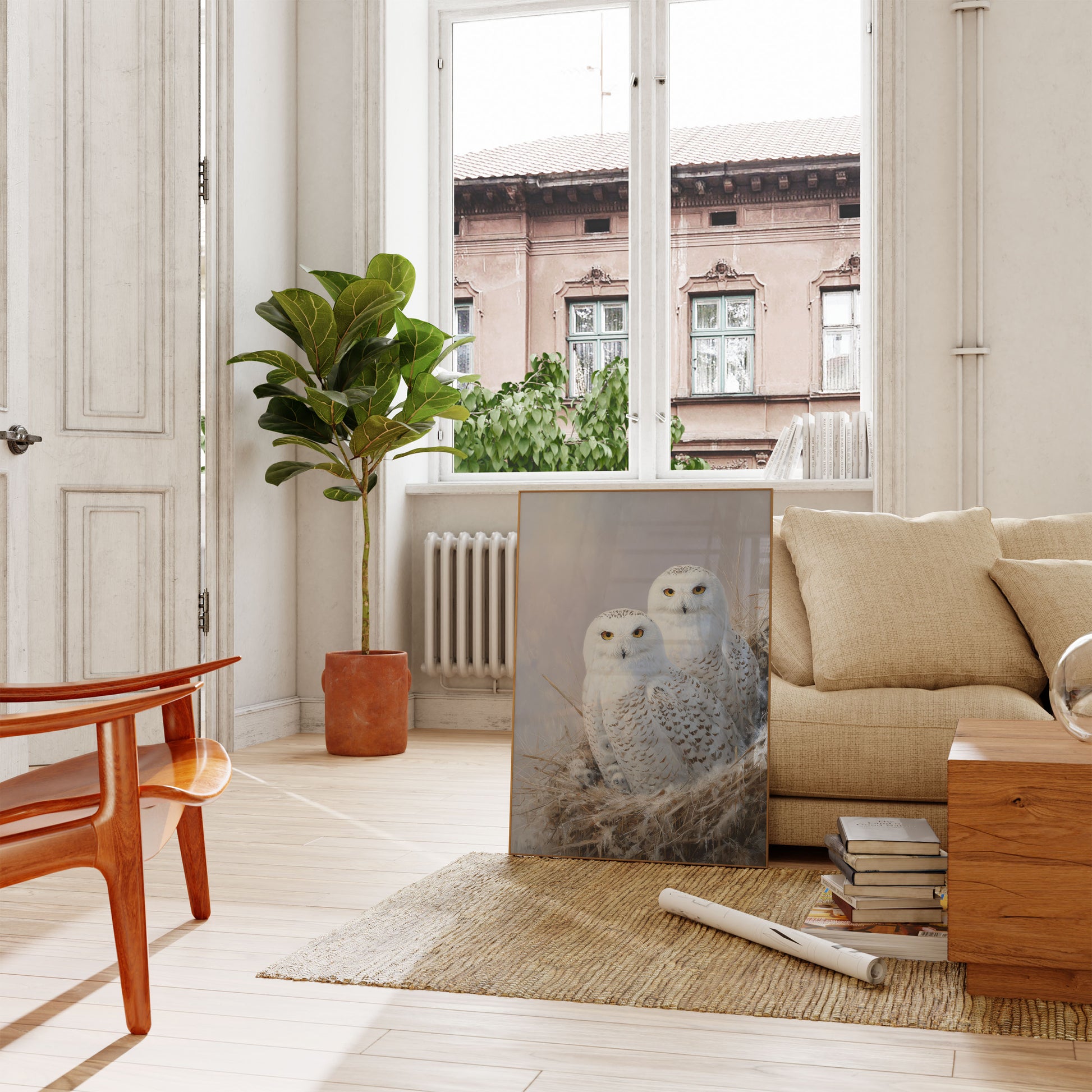 Denna fantastiska konstnärliga porträttbild fångar två vackra snöuglor som sitter tillsammans bland frostkysta gräs, med sina slående gyllene ögon riktade direkt mot dig med lugn intelligens. Kompositionen visar uglorna i sin pristina vita dräkt med fina bruna markeringar, satt mot en mjuk, dämpad vinterbakgrund som skapar en atmosfär av lugn stillhet. Detaljen och värmen i denna vinterscen från naturlivet ger en känsla av fredlig majestät till vilket utrymme som helst, perfekt för naturälskare och de som uppskattar den tysta skönheten hos arktiska varelser.