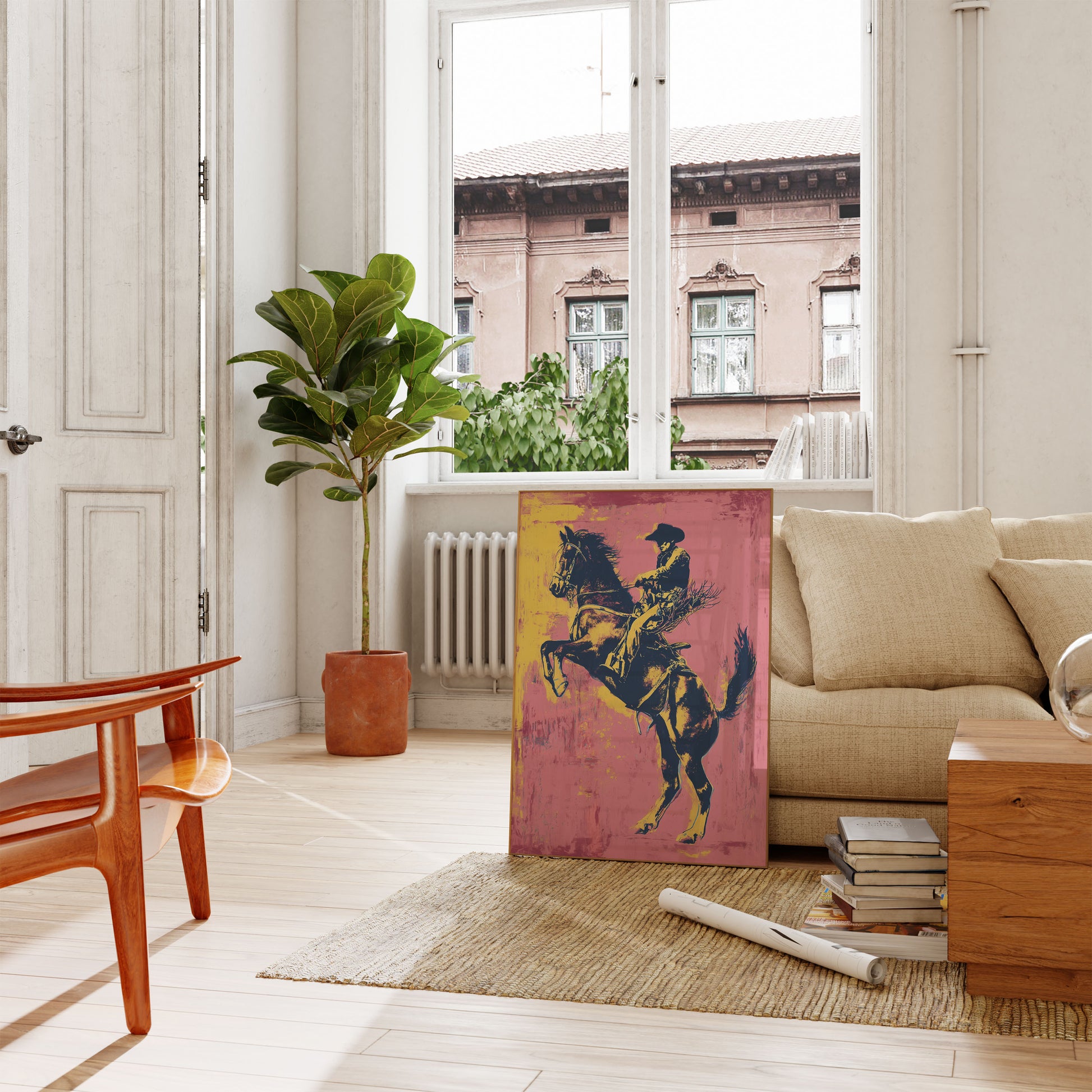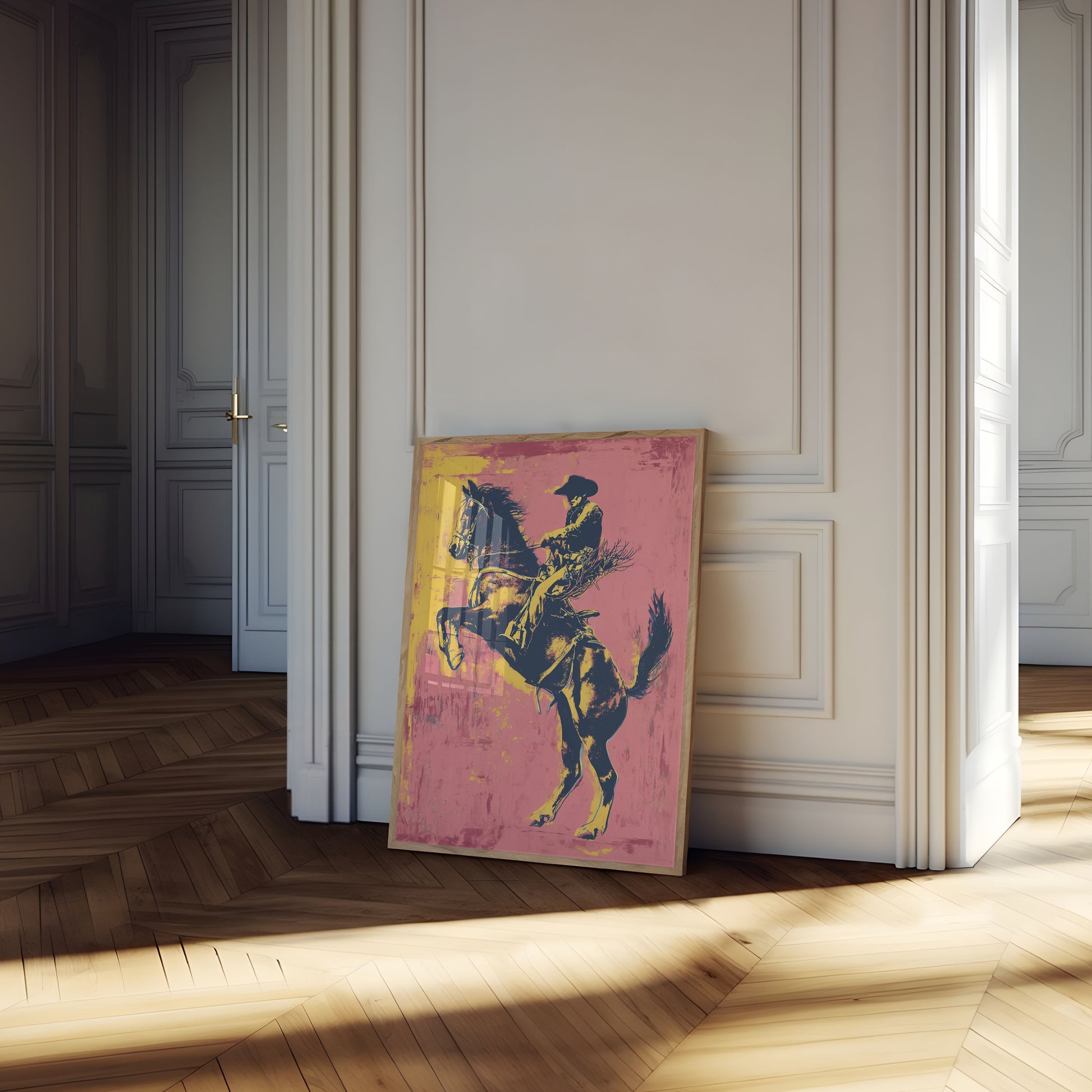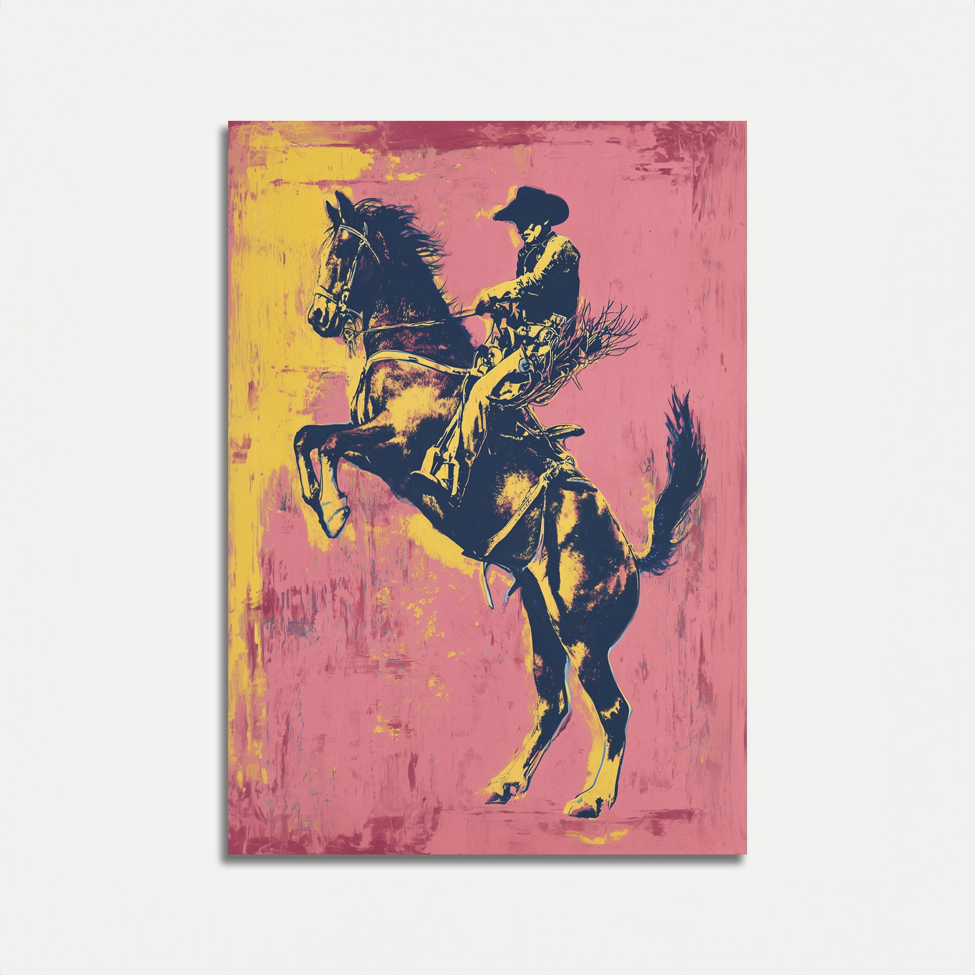Dyk ner i den elektrifierande världen av den amerikanska västern med denna dynamiska konstnärliga framställning av en cowboy som rider en vildhäst. Djärva gula och rosa nyanser skapar en levande bakgrund som fångar råheten och den tygellösa anden i rodeokultur. Den stiliserade konsten pulserar av rörelse och visar den intensiva förbindelsen mellan ryttare och häst i en häpnadsväckande visuell explosion.