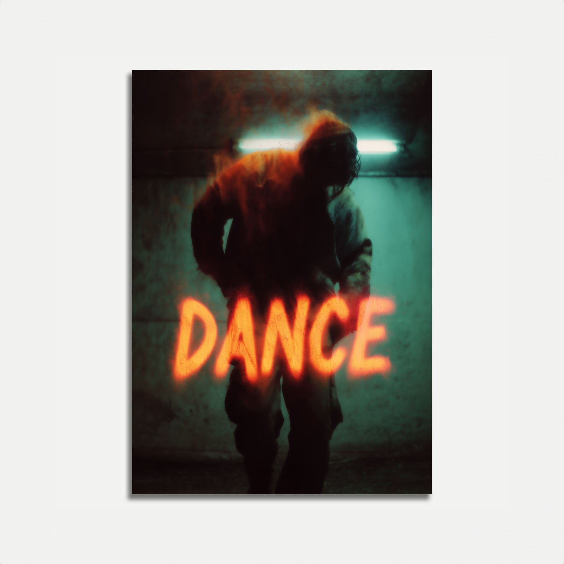En mystisk silhuett framträder mot en dyster tealfond, belyst av det eldiga orangefärgade ordet 'DANS'. Bilden fångar en kraftfull känsla av rörelse och intensitet, där urban atmosfär blandas med rå emotionell energi. Dramatisk belysning och fet typografi skapar ett slående visuellt intryck som pulserar av rå konstnärlig uttryck.