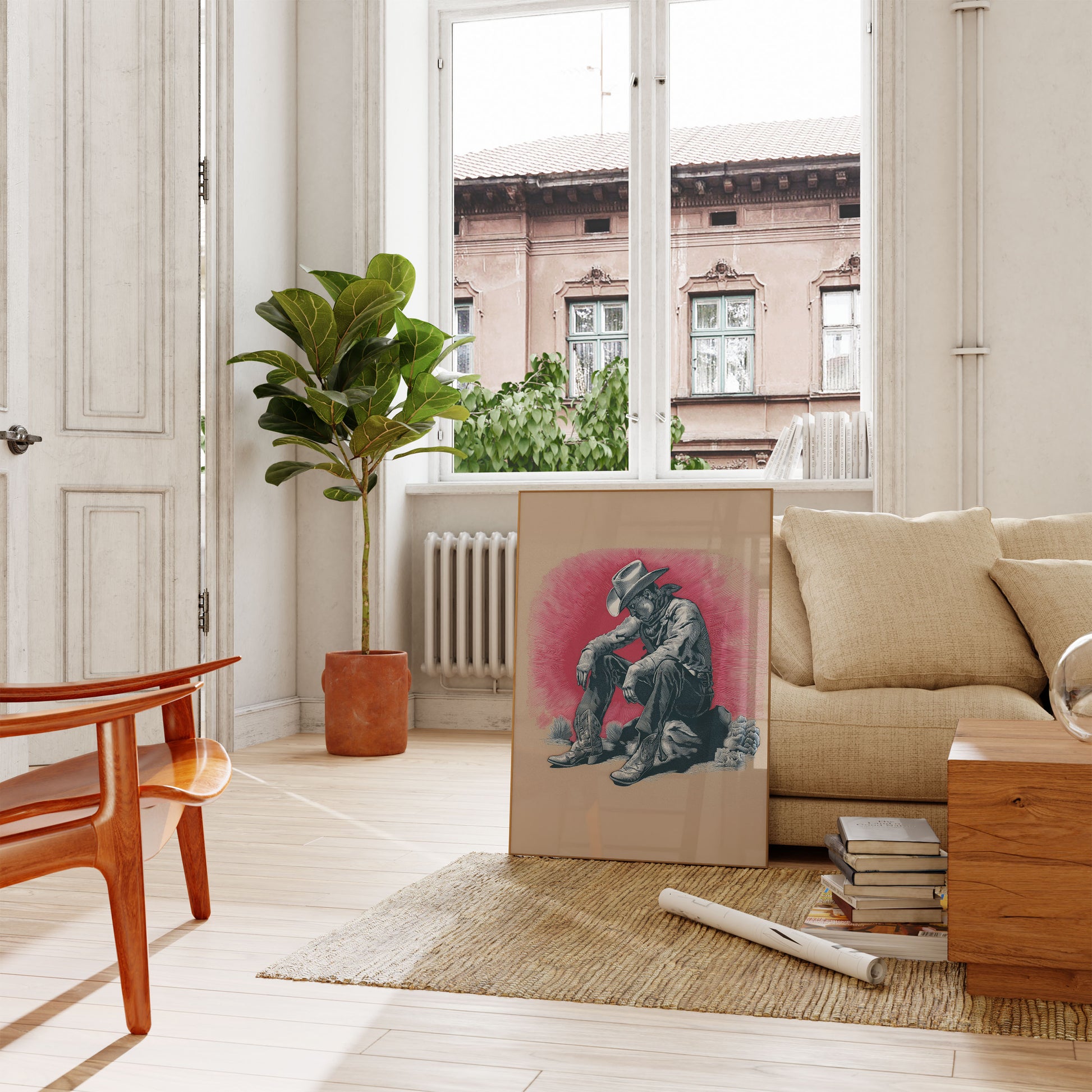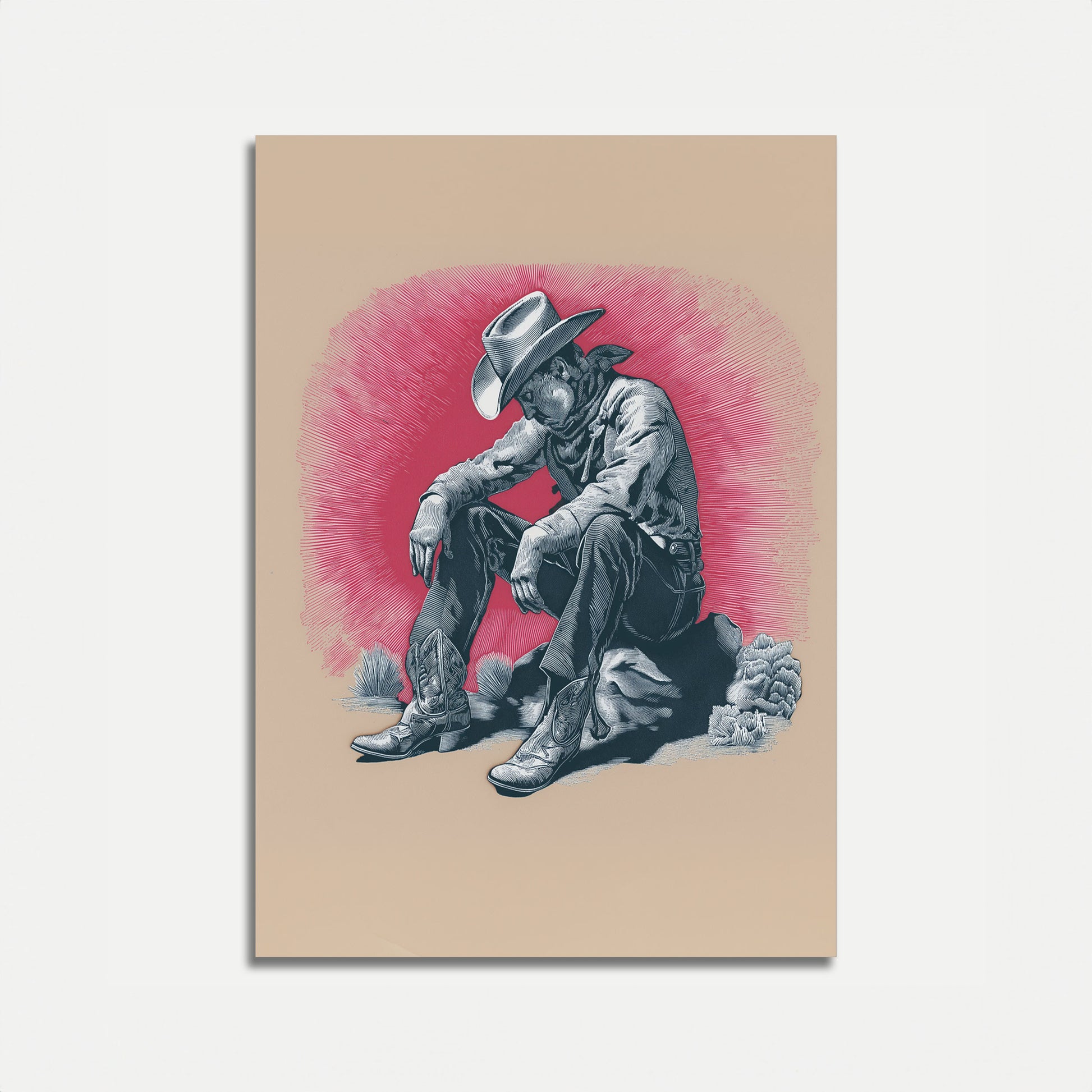 En kraftfull vintageinspirerad illustration som fångar essensen av den amerikanska västern. Detta slående konstverk skildrar en trött cowboy sittande mot en livlig rosa bakgrund, återgiven i detaljerad gråskalsgravyr. Den detaljerade cowboyen sitter med sin ikoniska hatt, slitna stövlar och en känsla av tyst beslutsamhet som talar om den robusta gränslandets anda.