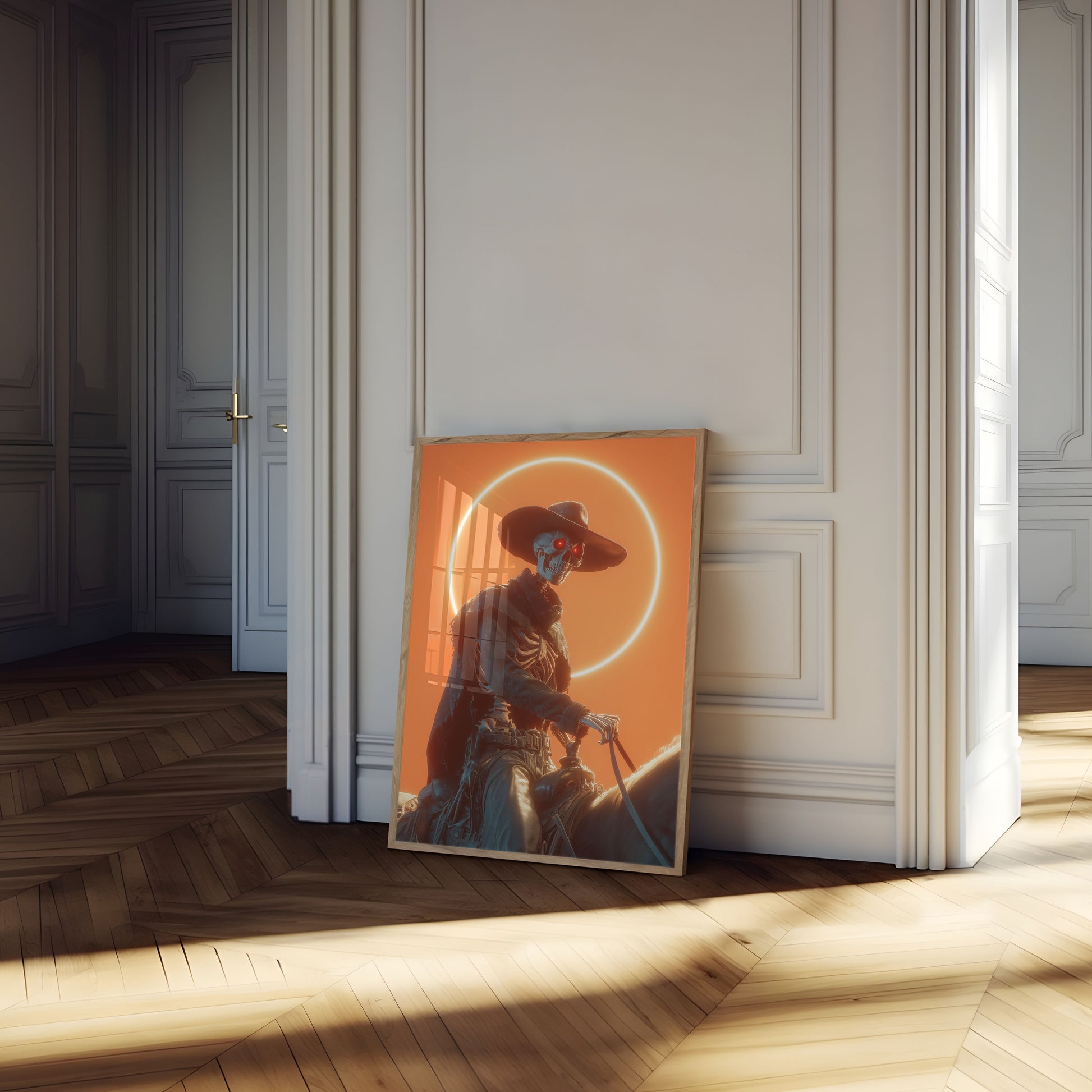 En fascinerande digital konstverk som föreställer en skelettlik cowboys ryttare mot en brinnande orange solnedgångsbakgrund. Den hemsökande figuren, prydd med en bred hatt och glödande röda ögon, sitter på en detaljerad häst och skapar en slående blandning av västlig mystik och övernaturlig förtrollning. Den lysande cirkulära halون och den orangea gradientbakgrunden förstärker den dramatiska, övernaturliga atmosfären i denna unika konstnärliga skapelse.