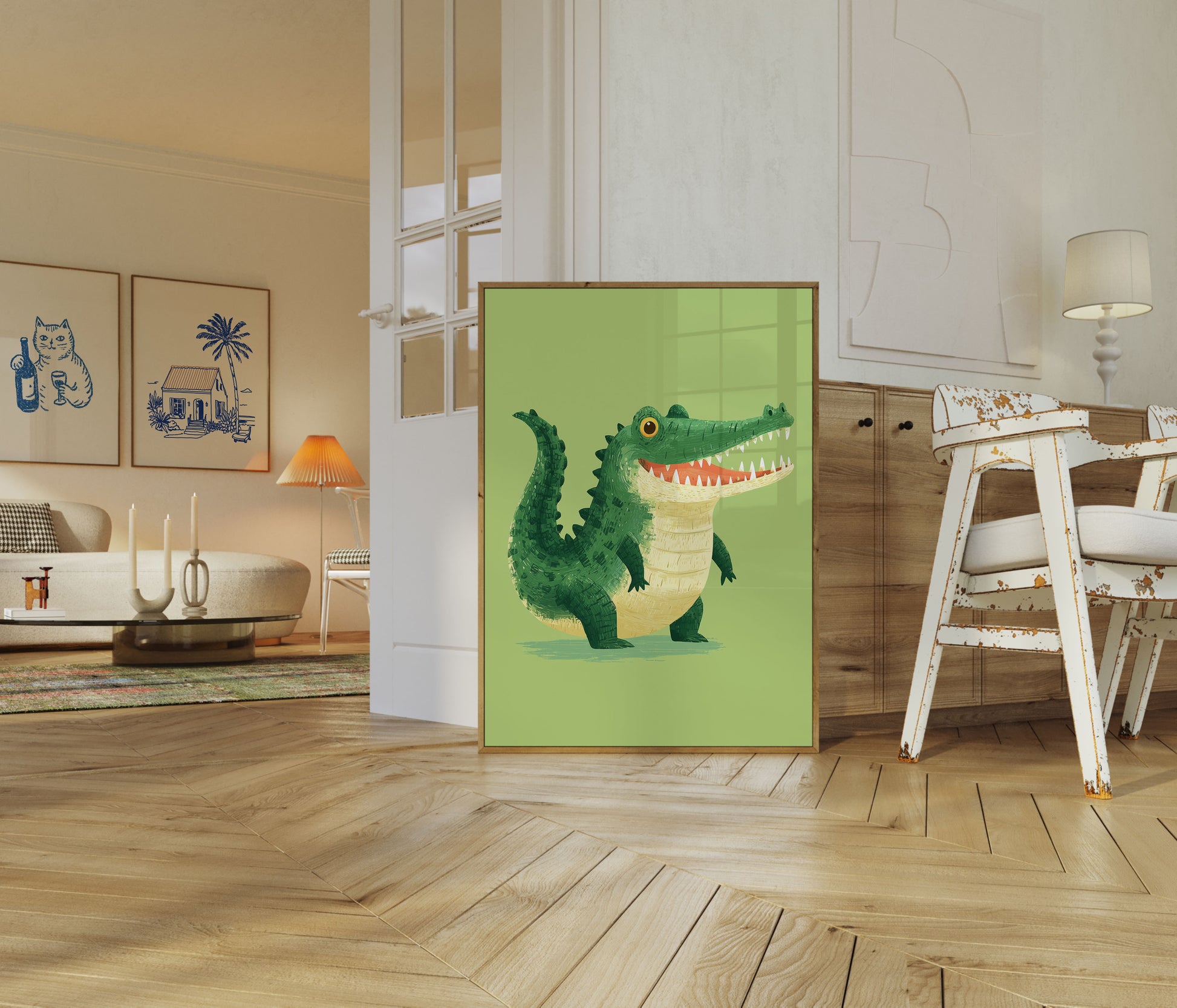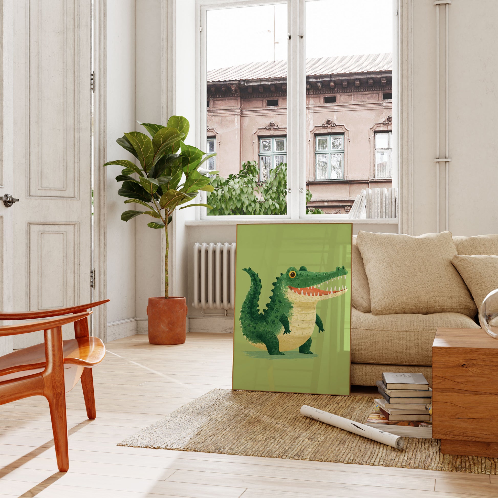 Denna charmiga illustration ger liv åt en glada krokodil med vibrerande gröna fjäll, ett brett tandigt leende och en lekfull personlighet som säkerligen kommer att få vem som helst att le. Den vänliga reptilen har slående gyllene ögon och en kremfärgad buk, inställd mot en mjuk, lugn limegrön bakgrund som skapar en varm och inbjudande atmosfär. Perfekt för barnrum, barnkammare eller någon som älskar udda djurkaraktärer med personlighet och charm.