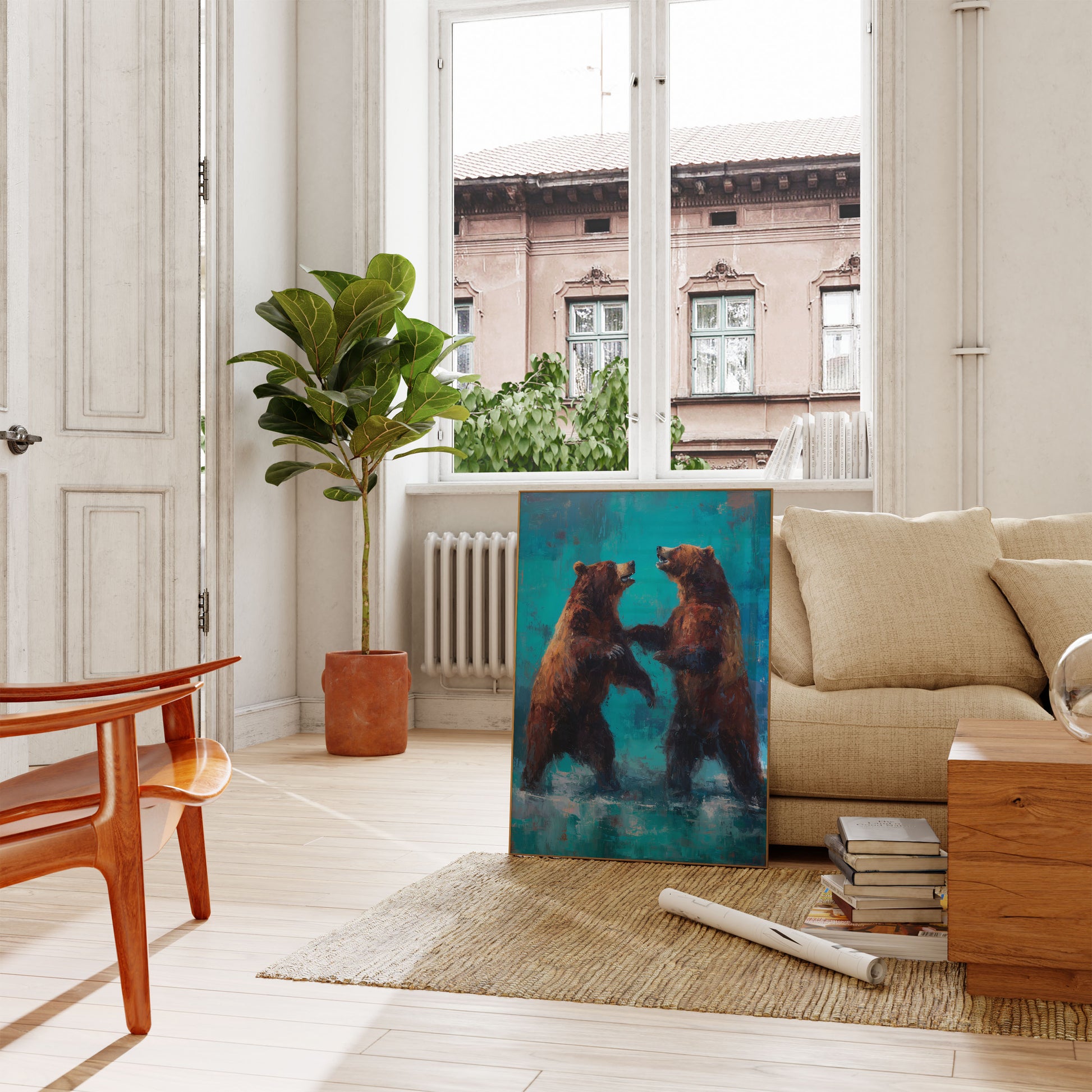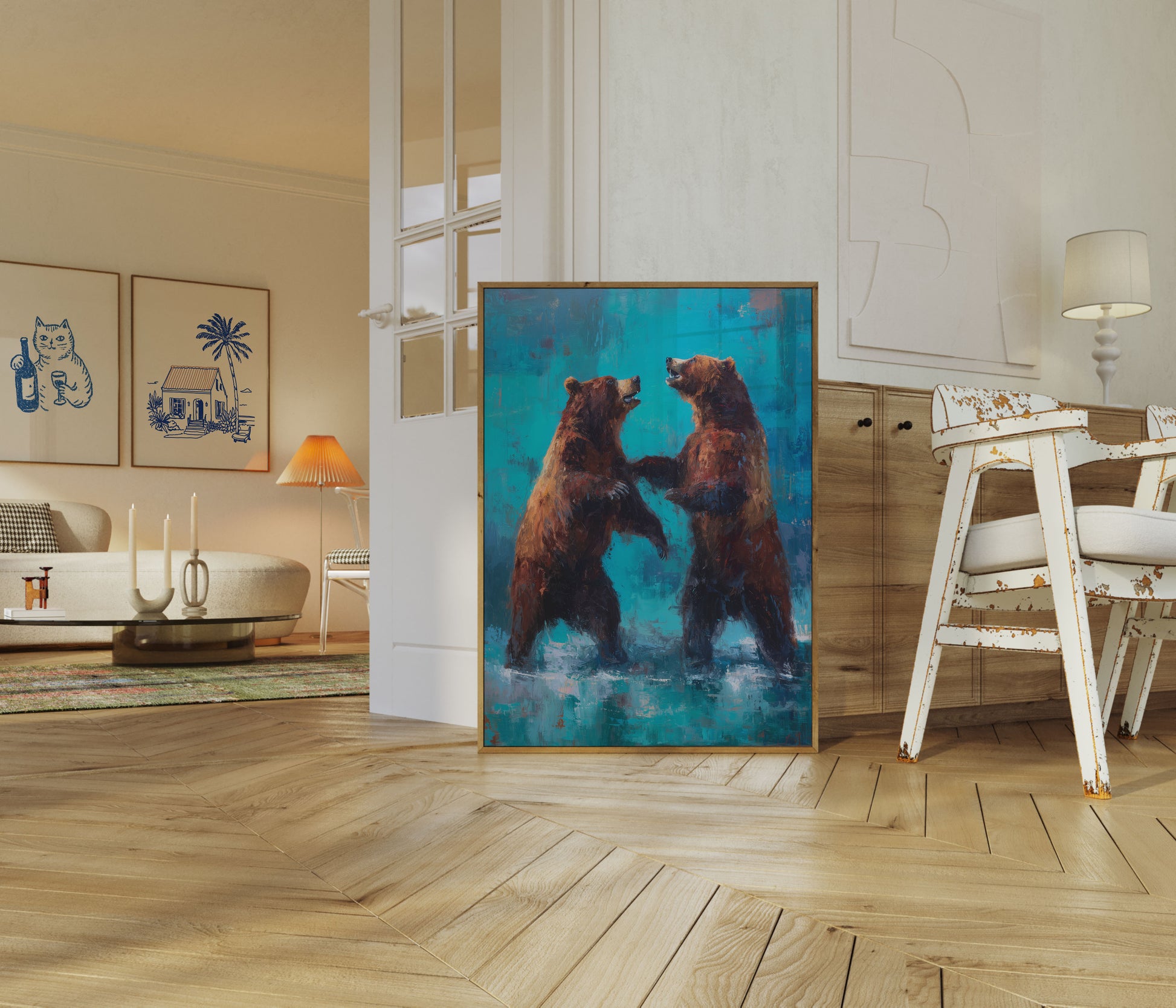 Denna fantastiska konstverk fångtar två majestätiska björnar som står upprätta i ett kraftfullt anslutningsögonblick mot en vibrerande turkos bakgrund. De rika, varma bruna tonerna på björnarna skapar en slående kontrast mot de kyla blå nyanserna, medan djärva penseldrag och uttrycksfulla detaljer för rå energi och känsla till scenen. Verket förmedlar vackert styrka, kamratskap och vild majestät—perfekt för alla som uppskattar vildmarkskonst med samtida flair och dramatisk konstnärlig stil.