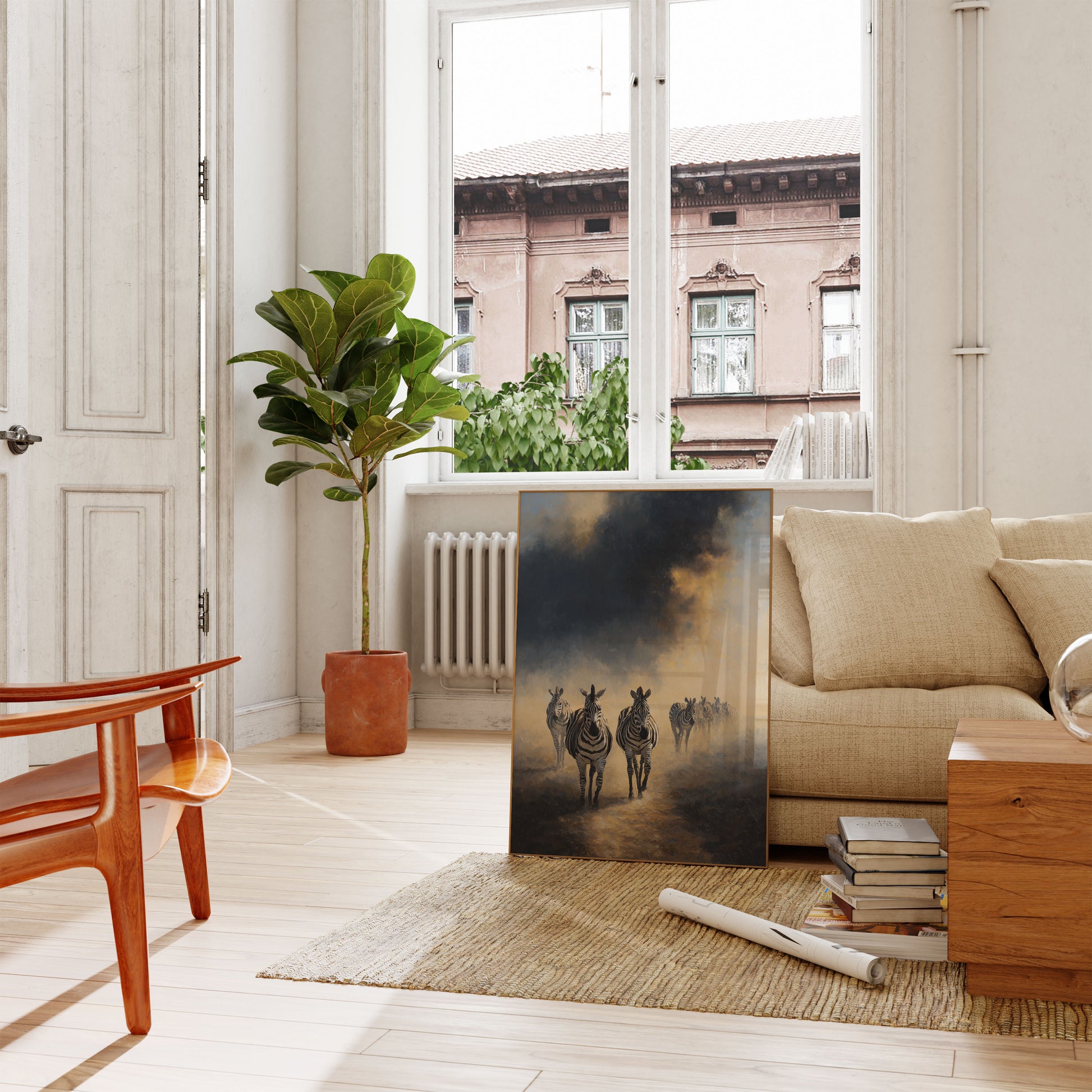 Upplev naturens råa kraft och skönhet med denna fantastiska zebrastampedkonst. En dramatisk hjord av zebror galopperar genom virvlande moln av gyllene damm, insamlad i ett ögonblick av okänd frihet och rörelse. Konstnären blandar mestarligt varma jordtoner med djupa skuggor och skapar en atmosfärisk scen som drar dig in i den afrikanska savannen. Mörka stormmoln hänger över huvudet och lägger till en känsla av brådska och drama till detta magnifika viltögnblick. Den rika, målningsartiga stilen för dessa ikoniska randiga varelser till liv med otrolig detaljering och känslomässig intensitet, vilket gör denna konstvägg till en perfekt mittenhylla för vilket rum som helst som firar vilt liv och naturlig skönhet.